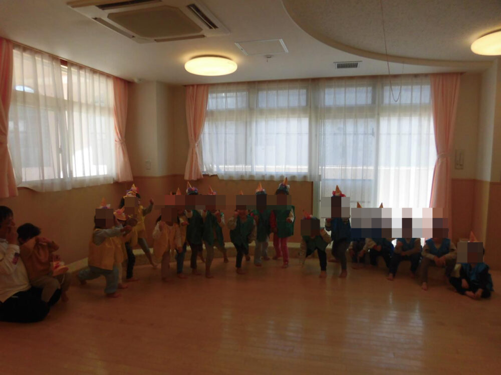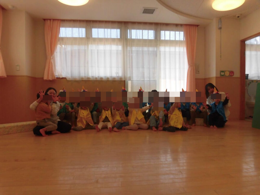 3歳児は「かわいいおにのなかまたち」のお話遊びで、仲間たちと歌を歌ったりかわいいポーズをとったりして楽しんでいました。